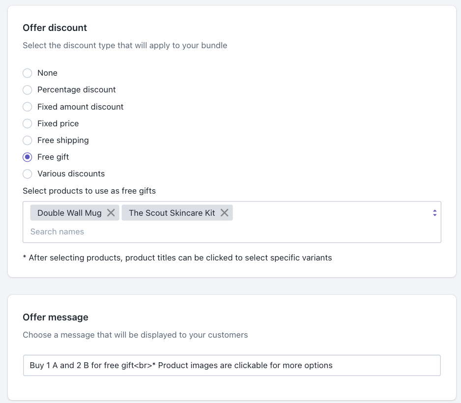 For example: set up "Buy 1 product from collection A and 2 products from collection B for free gift" with bundle like the screenshot below: